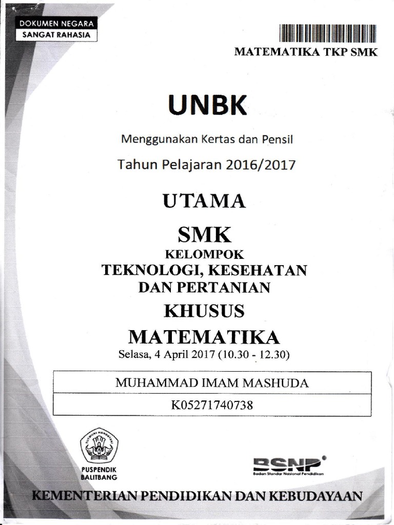 Soal unbk matematika smk 2017 pdf. Berikut inilah 40 butir soal matematika ujian nasional berbasis komputer unbk tahun 2018 sekolah menengah kejuruan smk kelompok teknologi kesehatan dan pertanian kelompok tkp mata pelajaran matematika yang terdiri dari soal pilihan ganda sebanyak 36 butir soal dan soal isian singkat sebanyak 4 butir soal. Latihan online soal un unbk unkp matematika smk tahun 20192020 latihan. Matematika tkp akp dan psp setelah tahun pelajaran kemarin admin sudah membagikan dokumen dari naskah asli ununbk smk tahun 2017 yang bisa menunjang tingkat kesuksesan para siswa dalam menghadapi ununbk tahun 2018maka pada tahun ini admin akan membagikan file naskah asli dari soal un smk 2018.