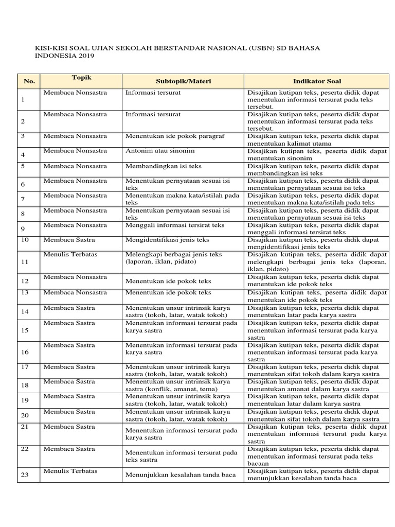 Kisi Kisi Usbn Sd Tahun 2018 Bahasa Indonesia Matematika