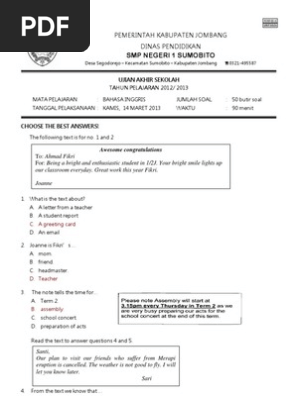 Soal Ujian Sekolah Bahasa Inggris Ix 2013 Plus Answer Keys