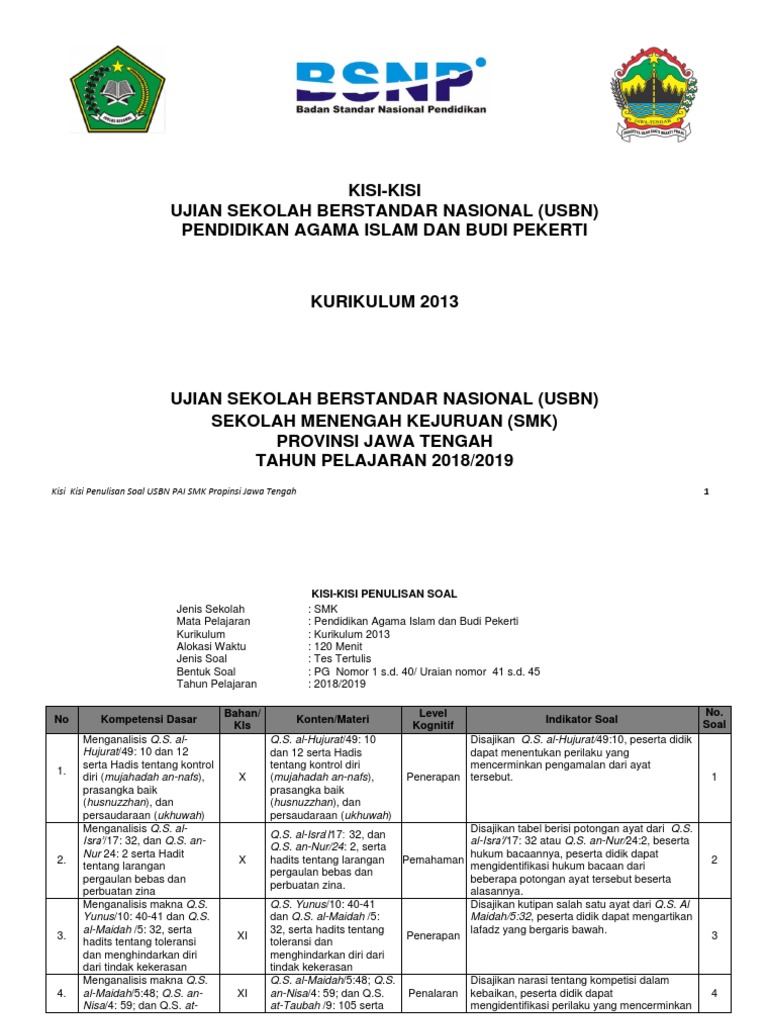 Contoh Kisi Kisi Soal Usbn Pai Sd Smp Sma Smk 2019 Wajib