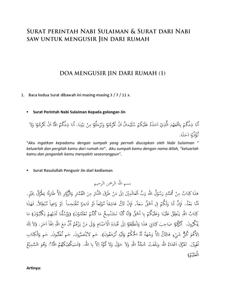 Doa nabi sulaiman mengusir jin. Bacalah doa di bawah ini sebanyak 3 kali di dalam rumah yang anda rasakan ada gangguan jin dan syaitan. Selain harus sering dibacakan ayat ayat al quran di dalam rumah ada juga doa yang biasa dipakai untuk mengusir jin atau hantu dari dalam rumah. Dengan kewibawaan beliau seluruh hewan tumbuhan baik jin baik dan jahat tunduk pada nabi sulaiman as.