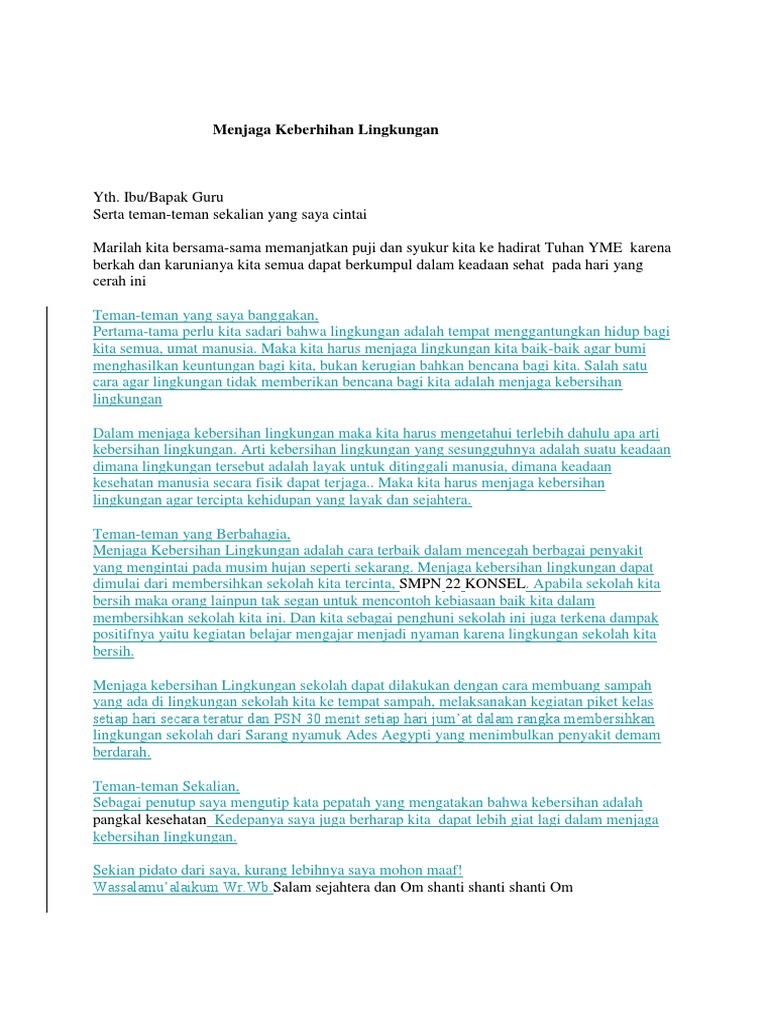 Puji syukur kita panjatkan kehadirat tuhan yang maha esa karena berkat rahmat dan karunia nya jua lah kita dapat berkumpul dalam keadaan sehat walafiat tanpa kurang apapun. Home contoh pidato teks pidato singkat mengenai penerapan pola hidup sehat. Menjaga kebersihan lingkungan merupakan suatu perilaku kecil yang dapat bermanfaat dalam menyelamatkan bumi kita.
