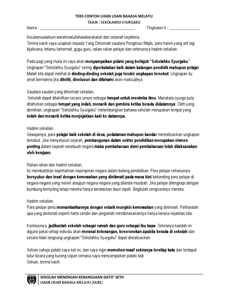 Bahasa sangat luas pengertiannya bahasa tidak hanya merujuk sebagai satu sistem linguistik semata mata tetapi bahasa juga citra budaya bangsa malaysia dan fungsi bahasa itu sendiri sebagai alat perhubungan sosial dalam masyarakat. Contoh teks pidato singkat yang akan mimin bahas seperti pidato tentang pendidikan bahasa indonesia agama islam tentang al quran pidato pembangkit semangat pidato sambutan acara atau event dan lain sebagainya. Contoh karangan peperiksaan setengah tahun tingkatan 5 2012 negeri johor.