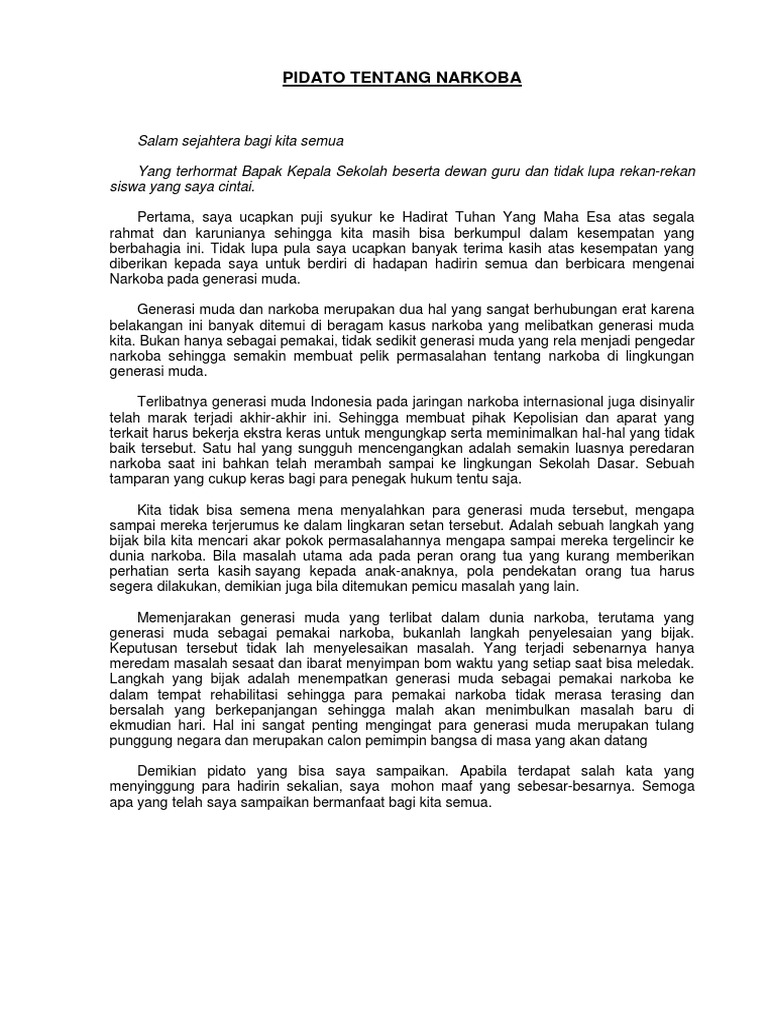 Selaku wakil kepala sekolah. Narkoba memang tengah menjadi kasus sangat besar yang tengah dihadapi oleh negara kita. Pidato adalah suatu ucapan dengan susunan yang baik dan sopan untuk disampaikan kepada orang banyak.