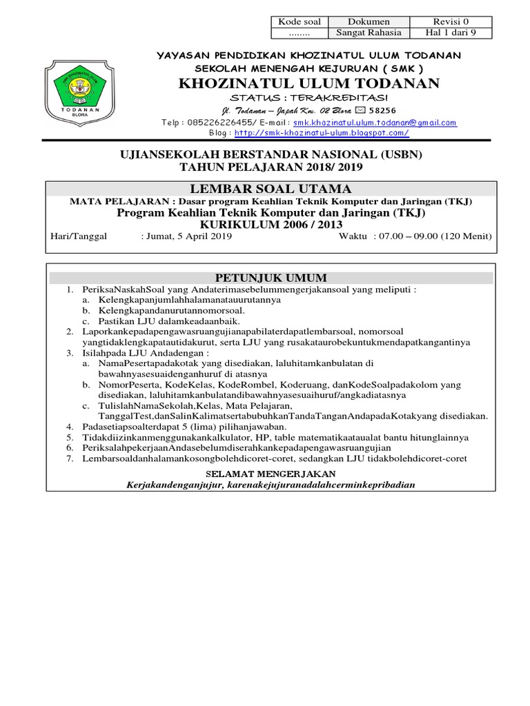 Contoh Soal Dan Jawaban Usbn Produktif Tkj Kelas Xii Smk