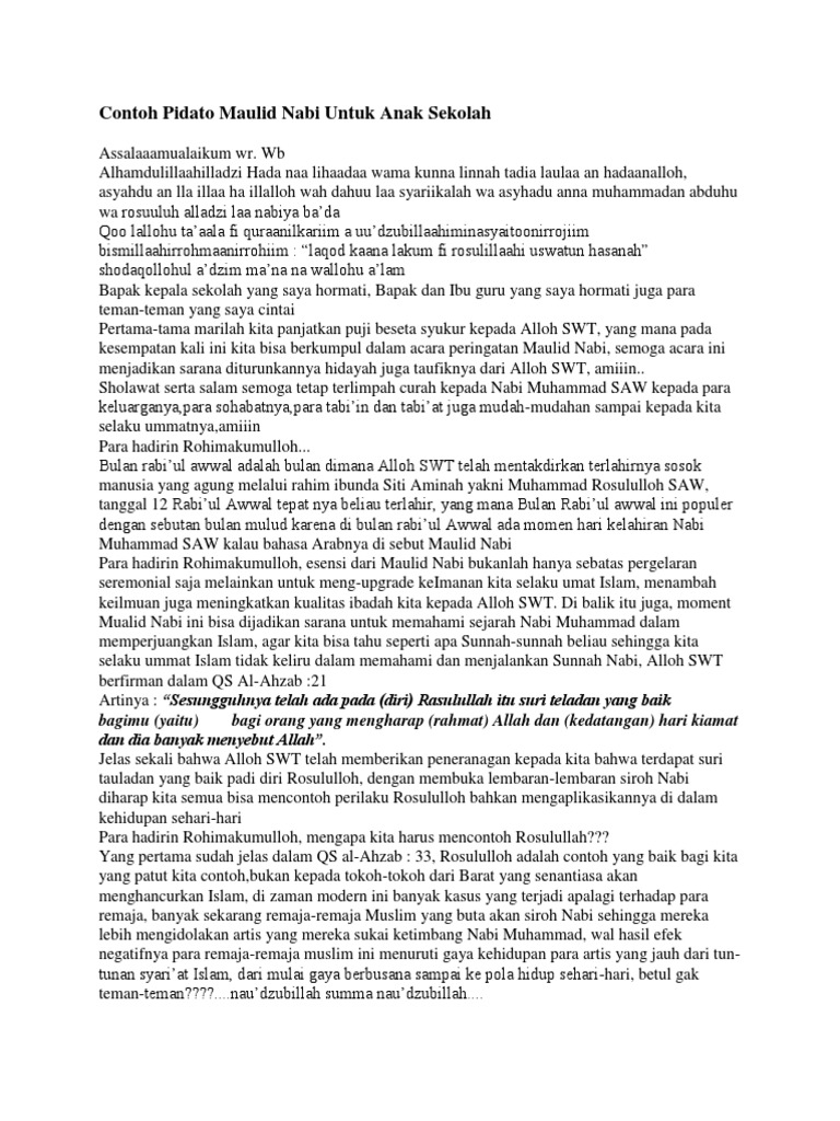 Contoh pidato peringatan maulid nabi muhammad saw assalamualaikum wr. Terlebih dahulu marilah kita panjatkan puji syukur kehadirat allah swt karena dengan rahmat dan karunia nya pada saat ini kita dapat memperingati hari mulud nabi muhammad saw dalam suasana cerah sehat walafiat tak kurang sesuatu apapun. Besar harapan kami dengan kita memperingati maulid nabi akan menambah keimanan dan ketaqwaan kita kepada allah swt.