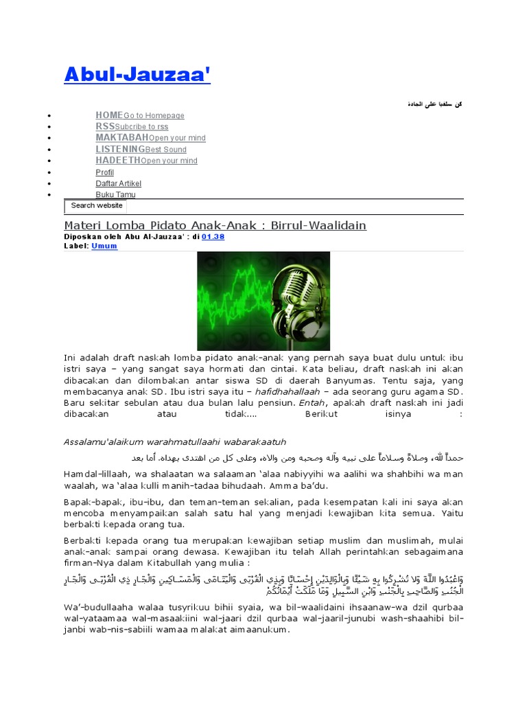 Teks pidato tentang berbakti kepada orang tua beserta dalilnya assalamu alaikum wrwb. Bapak ibu guru yang saya hormati bapak ibu staf tata usaha yang saya hormati anak anakku seluruh siswa sma negeri 21 batam yang bapak banggakan segala puji bagi allah yang menguasai seluruh alam.
