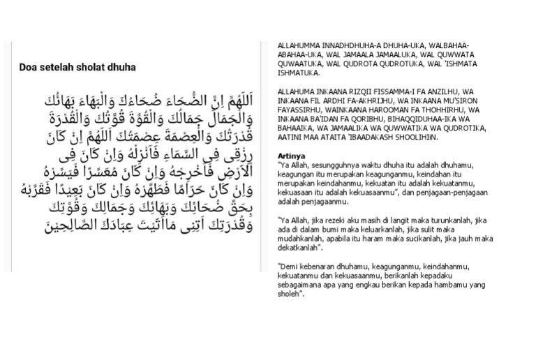 Doa dhuha dan terjemahannya. Salah satu keutamaan dan manfaat yang kita dapatkan dengan melakukan sholat dhuha adalah allah akan memudahkan rezeki kita dalam segala hal. Artikel ini akan membahas semua bacaan doa yang dibaca setelahsesudah selesai sholat sunnah dhuha lengkap dalam tulisan bahasa arab latin dan terjemahannyaartinya sesuai sunnah. Nama adh dhuhaa diambil dari kata yang terdapat pada ayat pertama yang artinya waktu matahari sepenggalahan naik.